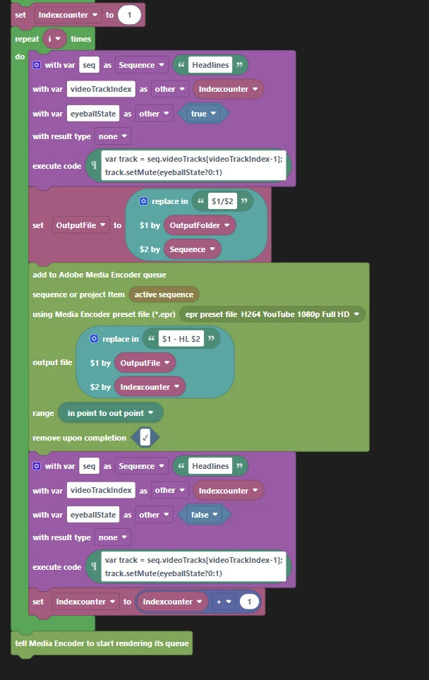 Basically, I want Automation Blocks to cycle through the tracks in the Headlines nest, make only one visible at a time, and export the main Video sequence with that version of the headline.