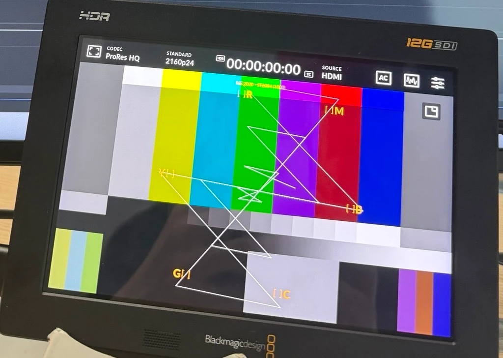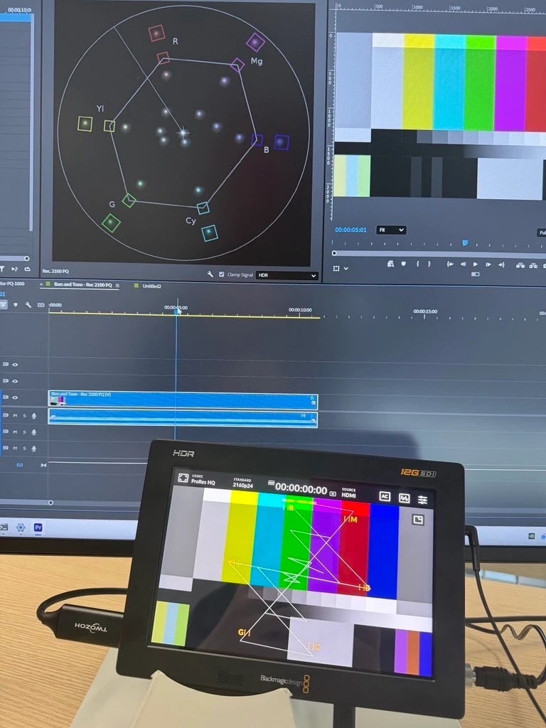 When I display the generated bars it looks correct on the Vectorscope of the Lumetri Scopes (set to Rec.2100 PQ), but on the Vectorscope of the BlackMagic Video Assistm colors seems off (the Video Assist mention that it is receiving Rec.2020 - ST2084 (1000) signal from the HDMI.