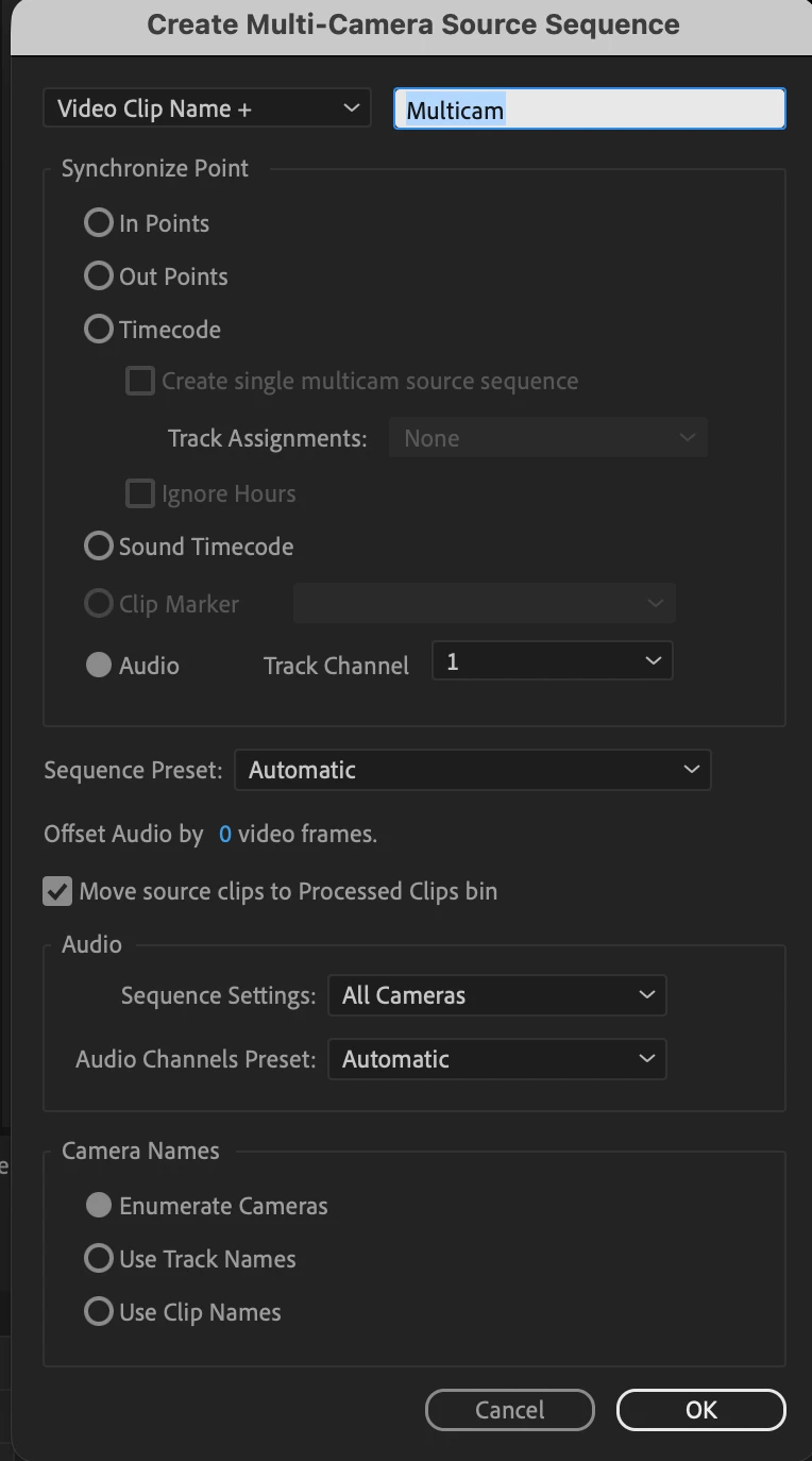 wait i think i just answered at least one of my questions. i followed the steps again to create a new multi-cam sequence from selected clips and opened the dialog. looking more closely now, I see that these default settings appear to indicate sync will happen based on audio waveform, which in this case worked. I do have some more questions regarding this, but i’ll try to organize my thoughts before i throw more at you. Thank you Neil