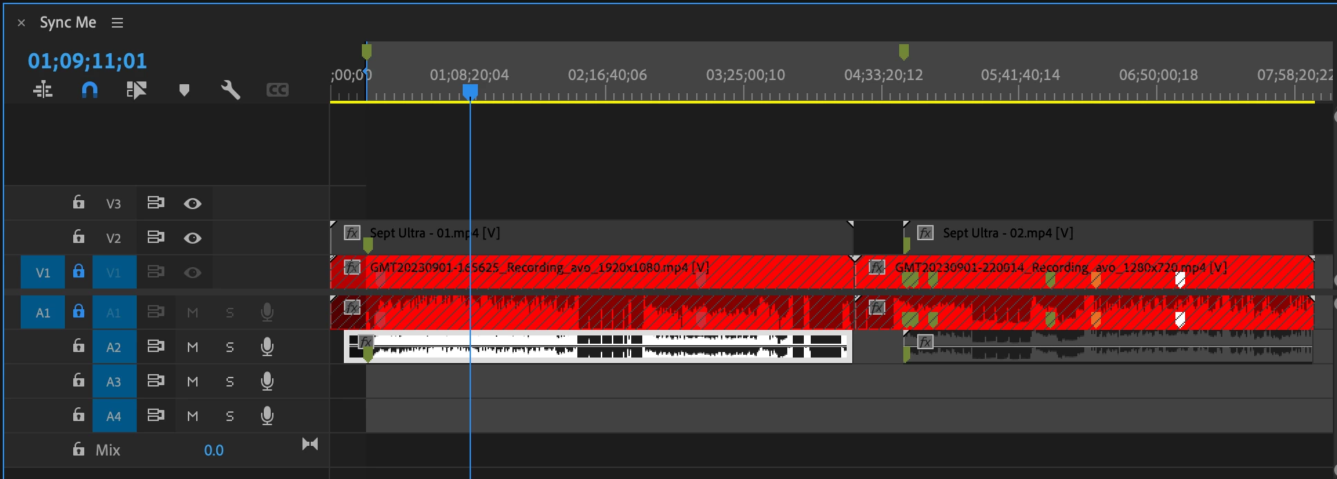 Main problem comes with both pairs of footage having different start and end times (all consisting of studio prep or a "starting soon" broadcast titlecard, nothing that will appear in the final delivery). I've synced the footage up in a timeline and I've ensured the resolution/frame rate/audio sync/pushin is all matched (screenshot included for clarity sake), my main dillemmas involve how to safely insert the new footage into the heavily-jumbled old timeline. I can't do a 1-1 "replace with clip from bin" as the differing start times will cause all the timings to break.