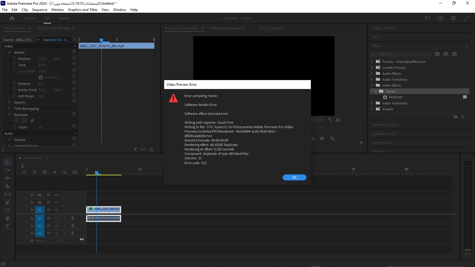 خطأ في معاينة الفيديو خطأ في تجميع الفيلم. خطأ في عرض البرنامج، تم إرجاع تأثير البديل خطأ. الكتابة مع المصدر : QuickTime إلى كتابة الملف : 11 ? IC: \ Users \ S IN O \ Documents \ Adobe Premiere Pro Video Previews Untitled.PRV \ Rendered - حول الرمز الشكلي: 00: 00: 00: 09 تأثير العرض: AE ADBE Replicate Rendering عند الإزاحة: 0.000 ثانية المكونة: نسخة أصلية من النوع AEVideoFilter Selector: 31 رمز الخطأ: 512 OK