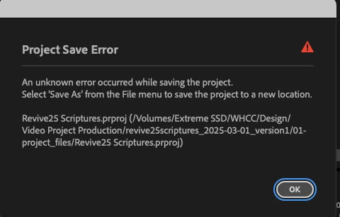 My project is no longer saving as I work or when I do it manually. I continually get "Project Save Error," which tells me that an unknown error occurred while saving the project and that I should use Save As to save in a new location. When I do this, it says the same thing again. I will go to the file where I saved it, and it will show the project but will not open it.
