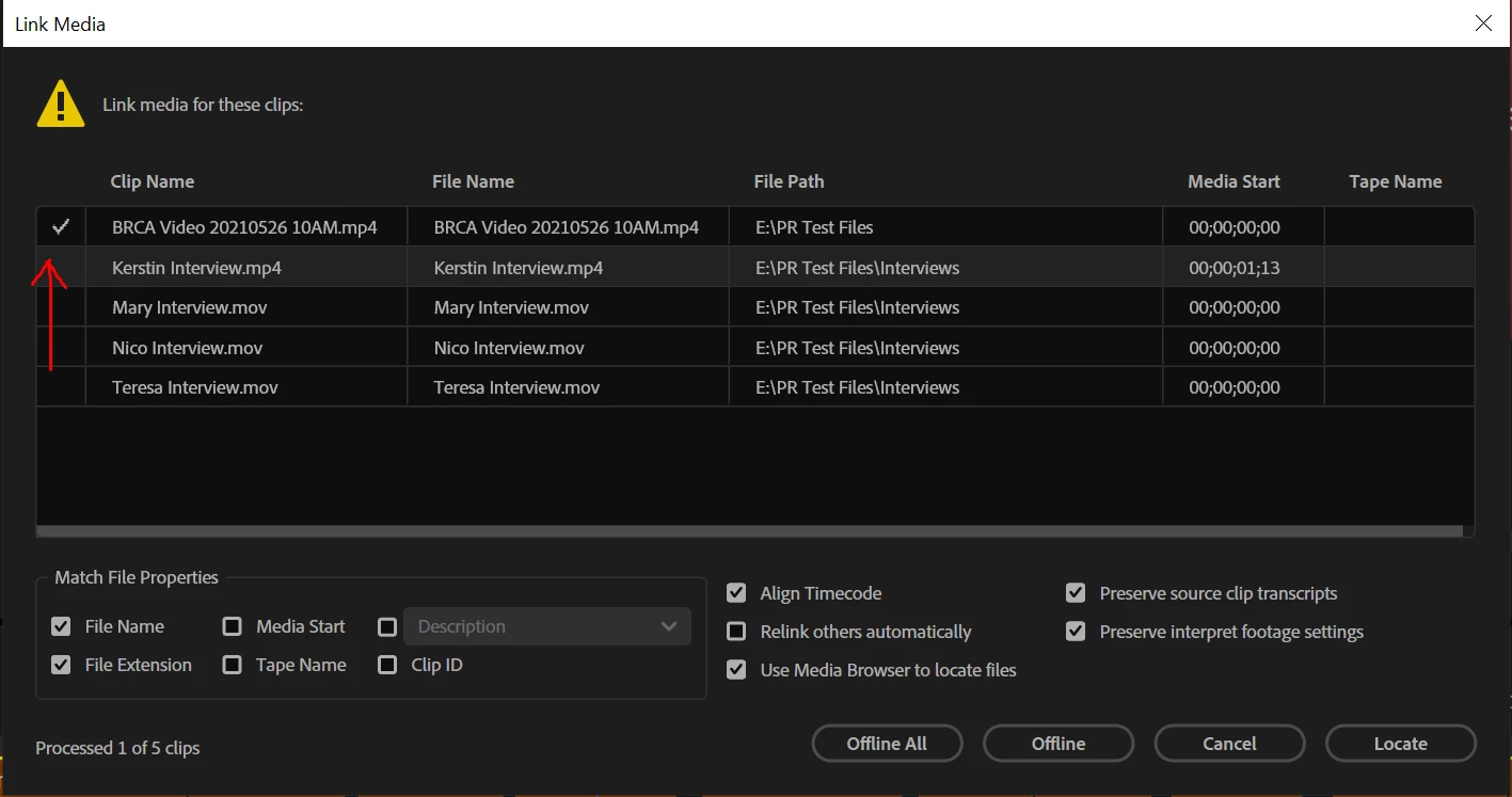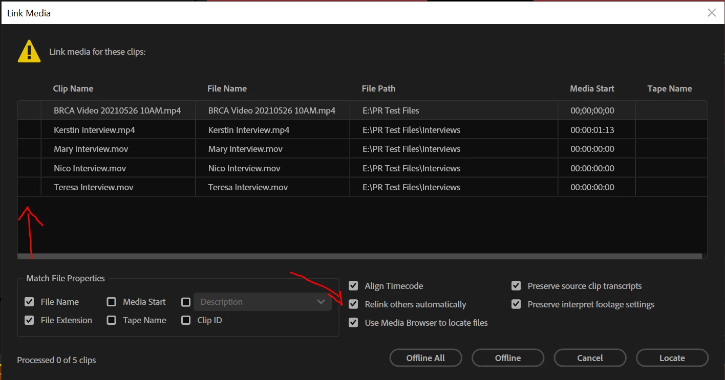 In at least one place, I think you said that at this step you selected one clip. You can't really select anything at this step. The top clip is highlighted, and there are no checkmarks. I do not recall it being mentioned, but at this step, make sure that "Relink others automatically is checked." I think it is selected by default, but it is "sticky" for being deselected for some conditions.