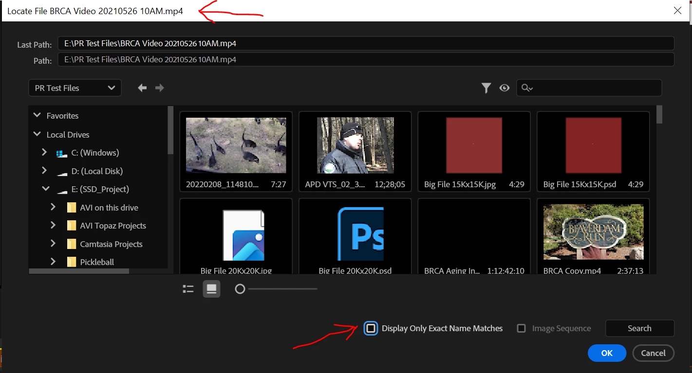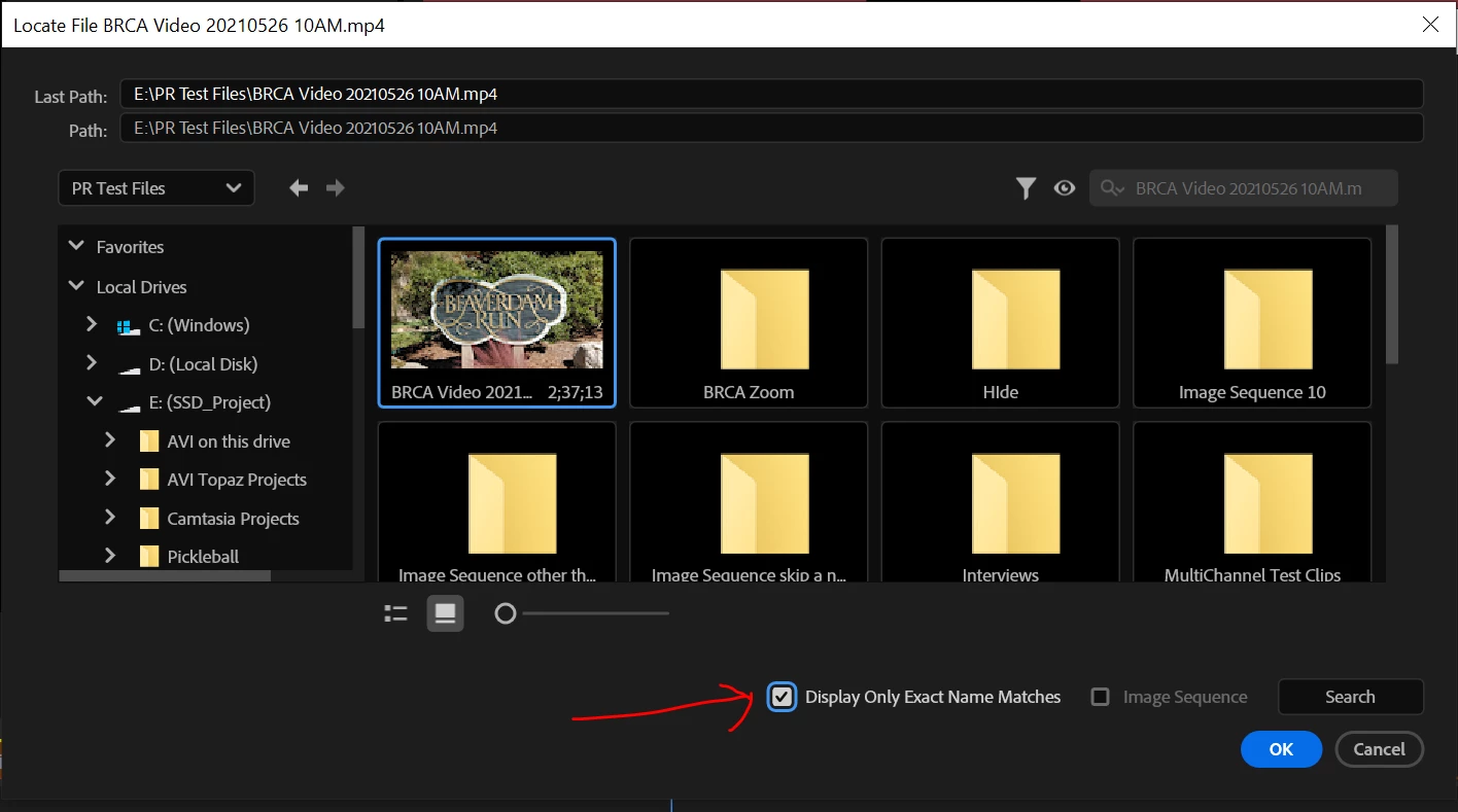 Notice that the "highlighted" file from the previous step is at the top as the one currently being located. To make seeing it easier, make sure that "Display Only Exact Name Matches" is checked.