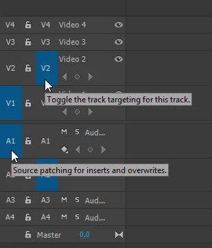 2. PATCH: Click the V1 & A1 "blue boxes" to enable them in the far left of the Timeline. (see the image).