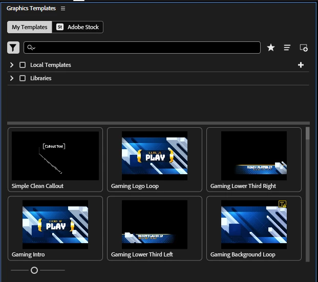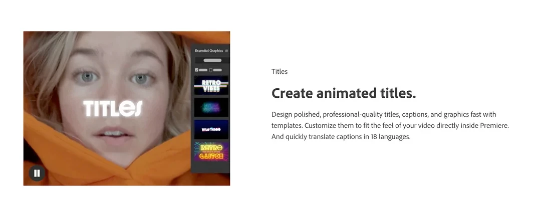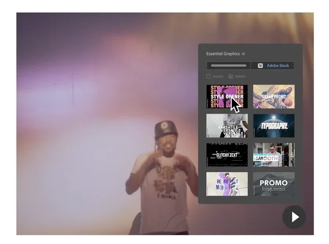 I see this on the Adobe Premiere page, but can't find anything that looks like these in the Essential Graphics resources; they essentially convey that there is some type of “Essential Graphics” library available for drag-and-drop. It does not expressly say that these templates (titles or effects) are available, or only available, as paid extras.