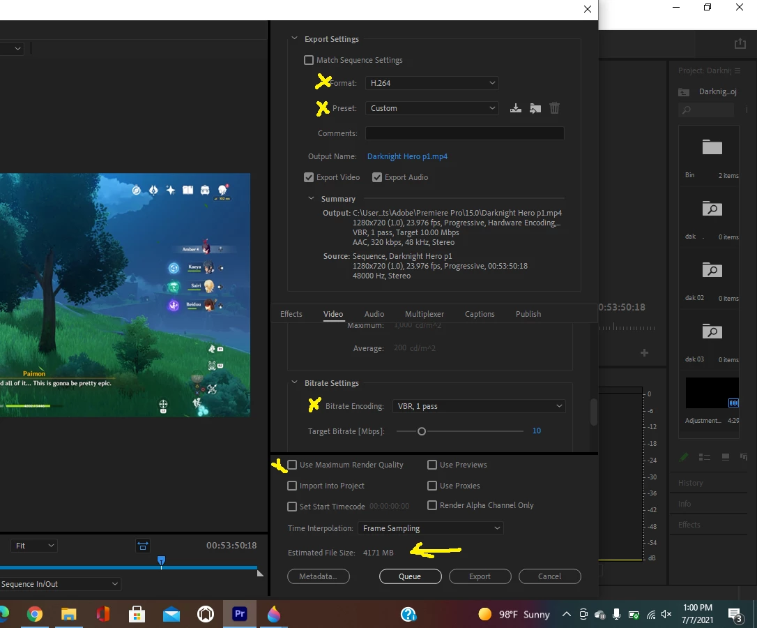 Next, I went to the Export Settings. I have made the "Format" in the H.264 and I have set the "Preset" as either "Custom" and "Match Source-High Bitrate" and as "Youtube 1080p Full HD". I also wen to the "Bitrate Encoding" part of Video and selected either "VBR, 1 Pass" or "CBR". Lastly, I sometimes checked or unchecked the "Use Maximum Render Quality" box. I noticed that checking the box changes the "Preset" to "Custom". However, all these options I have a low MB file size in the bottom of the screen where it says "Esteemated File Size".