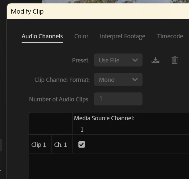 When I inspect the audio channels of the clip, it shows it being mono with just one channel (below).