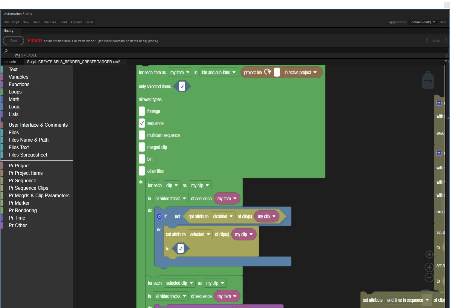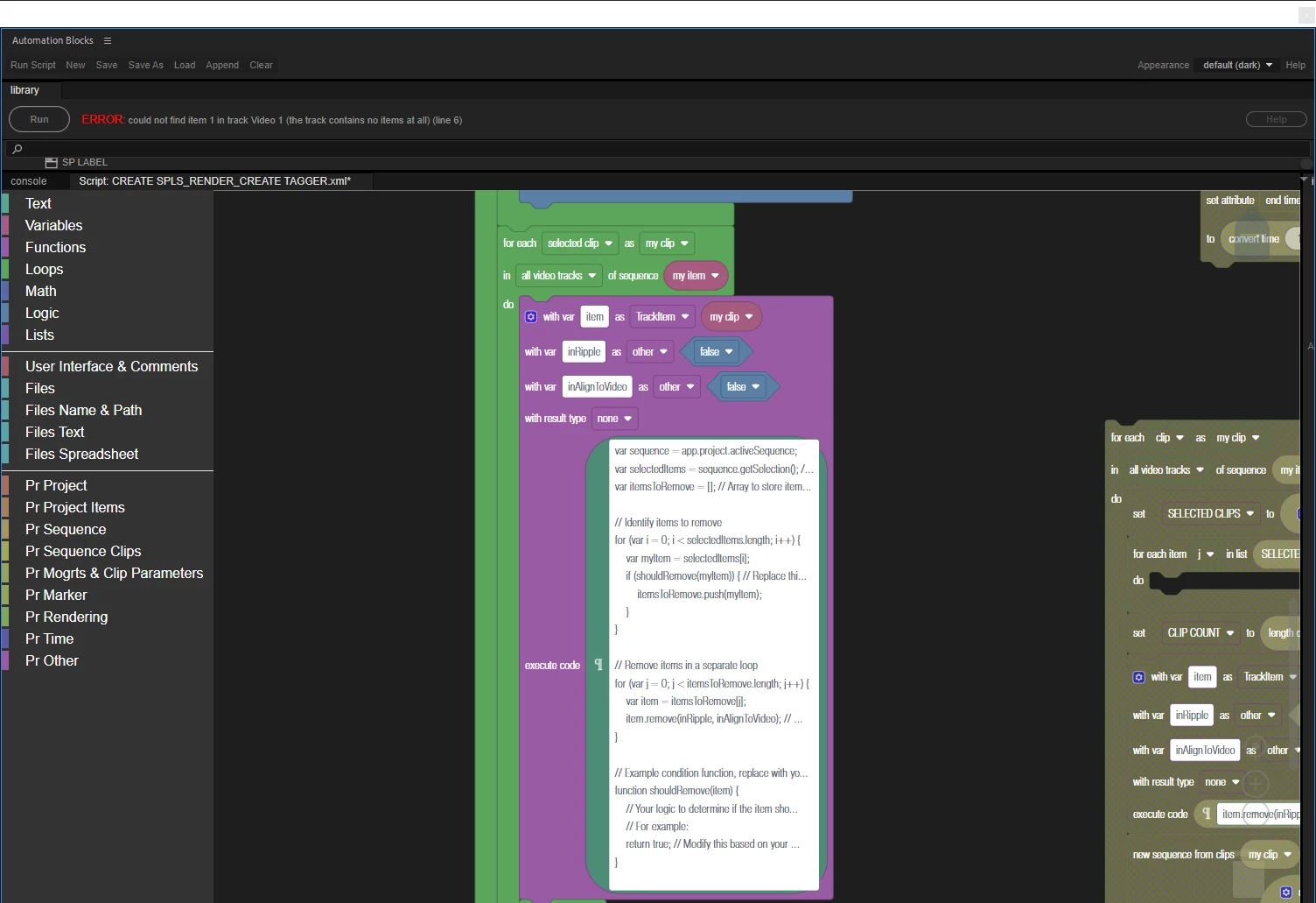 I started out using the clip.remove execute code as defined in the block reference, but that ended up only deleting every other clip in track 1. I then used chat GPT to modify the execute code. So far I have it working but once it has successfully removed the clips, I get an error "execution result:could not find item 1 in track Video 7 (the track contains no items at all) (line 6)". This is because my clip.remove block is still going even after removing the selected clips. I am not sure how to revise the execution code so that it stops after successful removal.