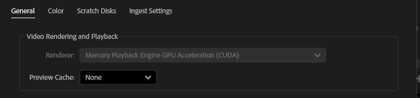 Project Settings: Mercury Playback Engine GPU Acceleration (CUDA) is Enabled.