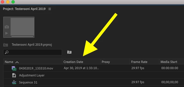 Add the creation date column to the metadata bar in the list view of the Project Panel: