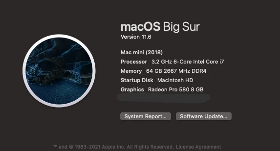 My workstation specs: iMac 4,2 GHz Quad Intel Core i7, 64Gt RAM, Radeon Pro 580, 8 Gt, 1 Tb HD
