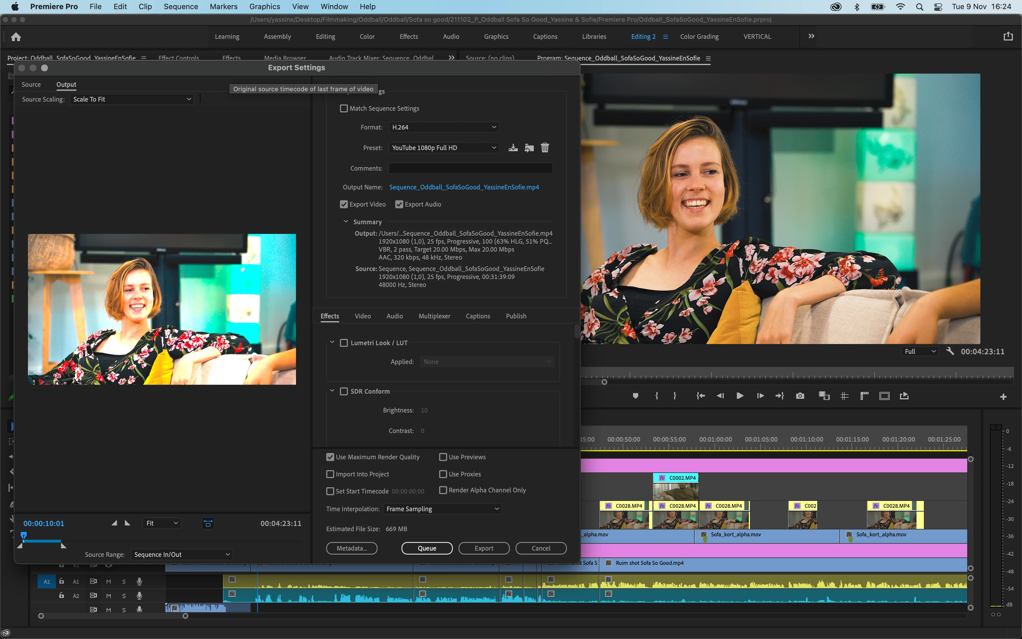 Export colour space is REC709 (and I'm exporting in the format H.264 and Match Source - High Bitrate)