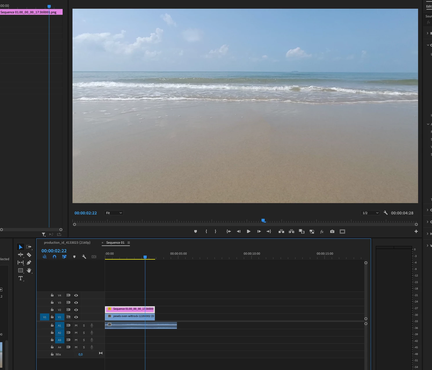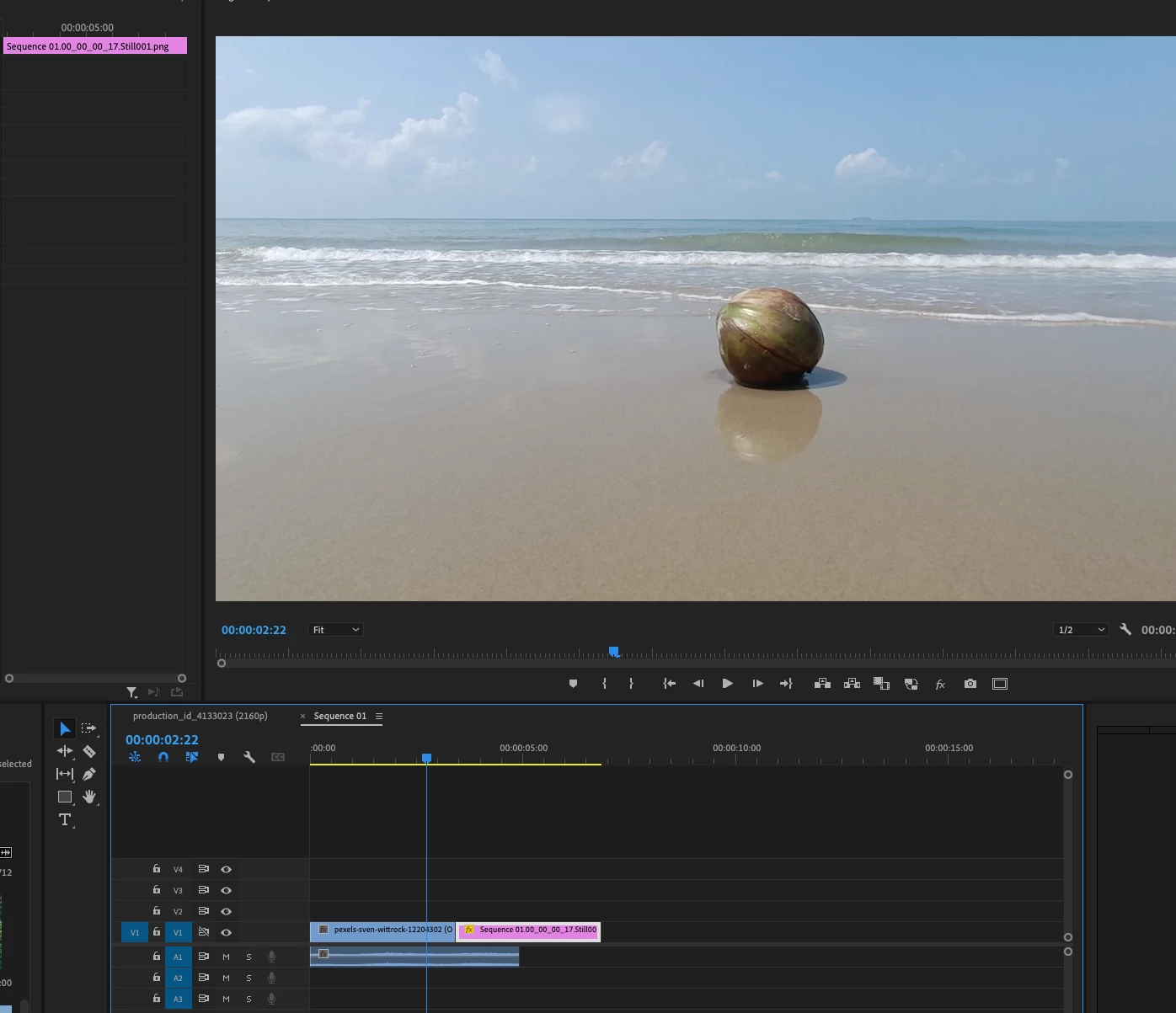 Your top layer is a still and it covers the entire frame. You need to create a mask around your coconut clean plate so that you can see though onto the video below.