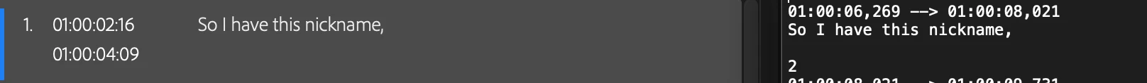 Left is the text edit panel w/ timecode in Premiere, right is exported SRT file in TextEdit.