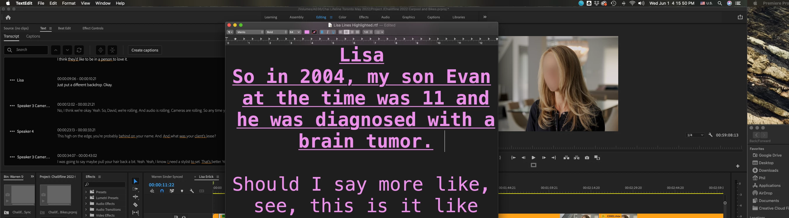 Is there a way? I created a transcript of a long interview, exported it as a Text File and deleted allll the speakers 2, 3 and 4 (the interviewer and camera crew) and now want to Import that .rtf as a premiere Transcript so I can then jump to or make subtitles of Only the time Code where Lisa Talks?
