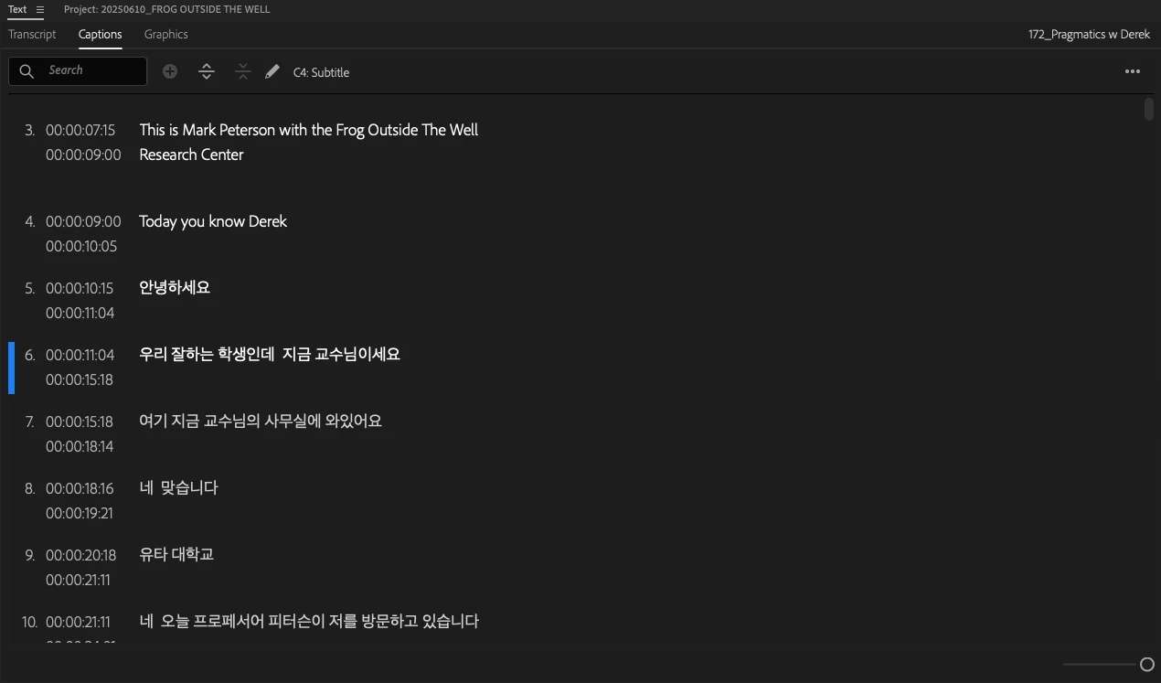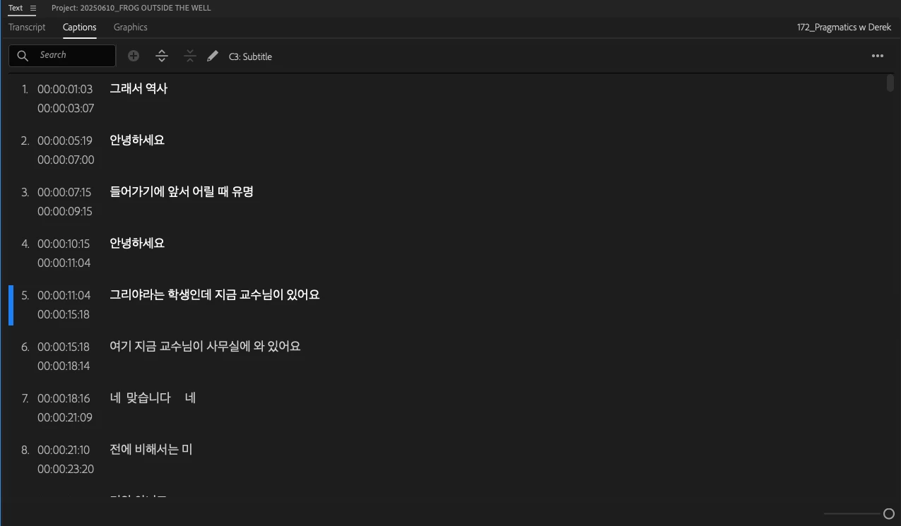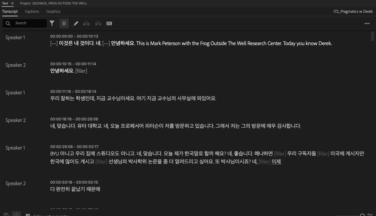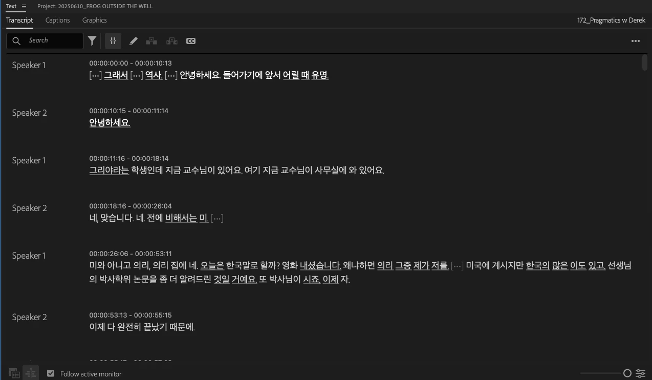 2. I right click the video and use "Transcribe" I select "Korean" and "seperate speakers"