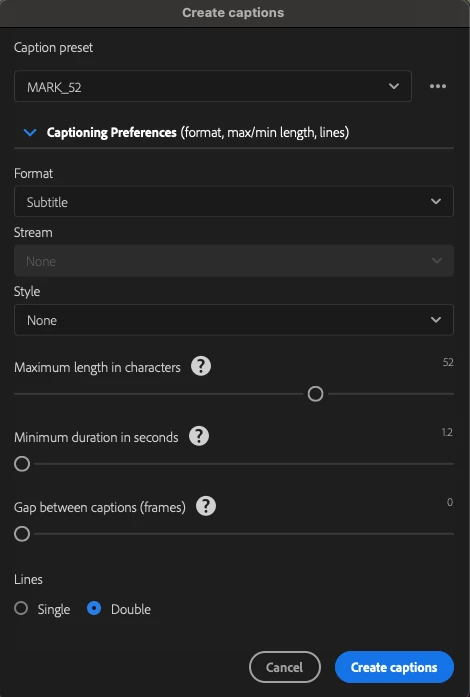 5. I create a sequence from the clip and hit the "Create Captions" button. The captions that are created do not have any punctuation. The only workaround I have found is to replace "." and "," with ";" and "..." after they are created I then go back and replace them with the original punctuation.