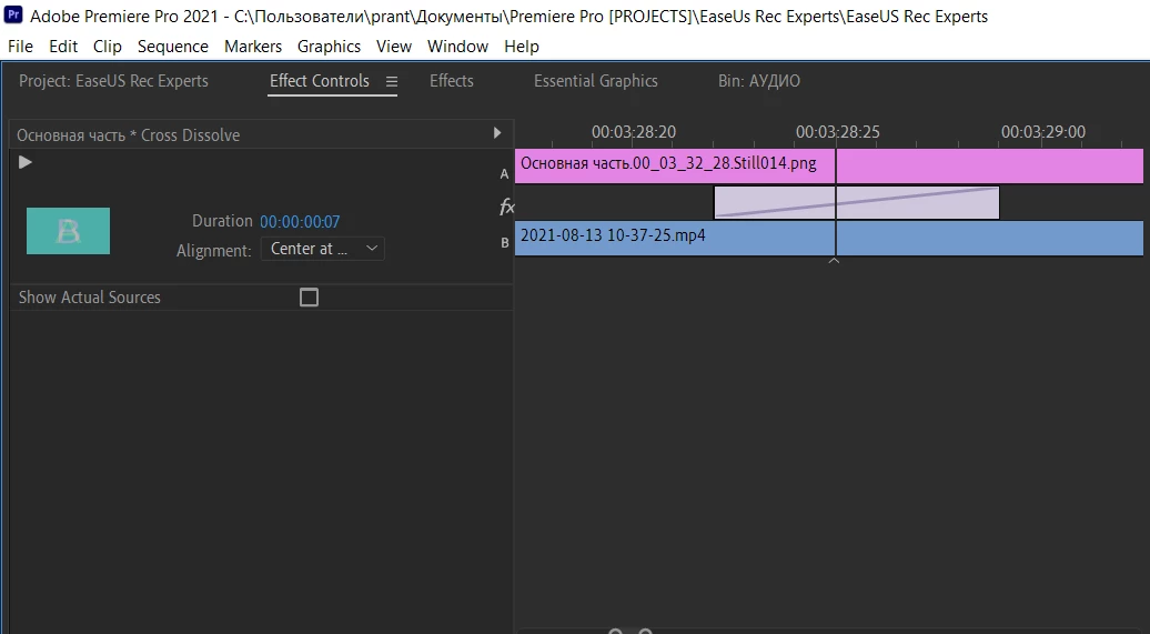 When I want to add a cross disolve transition between two clips, it distributes unevenly. It seems to me that the left part is shorter than the right one.