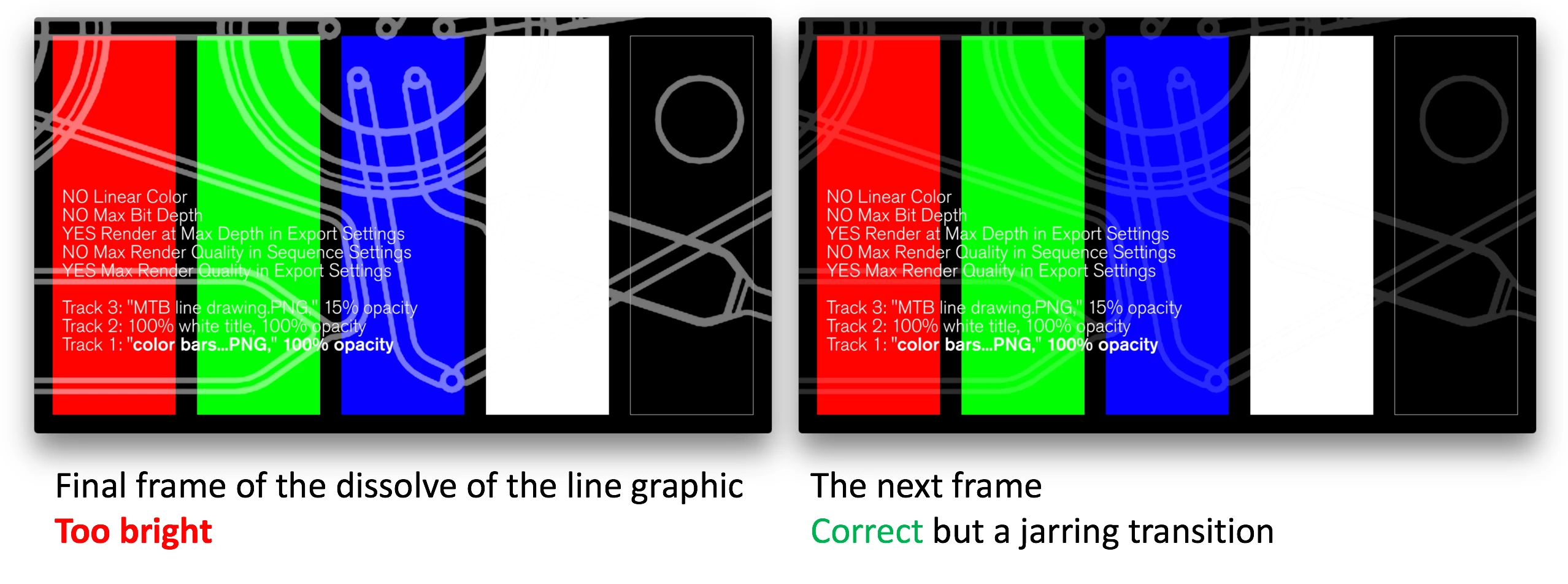 Cross dissolve is too bright with a low-opacity clip, MRQ, and disabled Linear Color