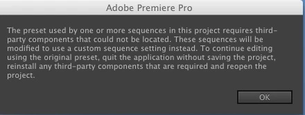 Jason: Unsure what the sequence settings are as I took over from another editor running CS 5.5. The missing effects were some video transitions in the .mov format. What I ended up doing was copy-and-pasted to a new sequence, and all is well - project is delivered.