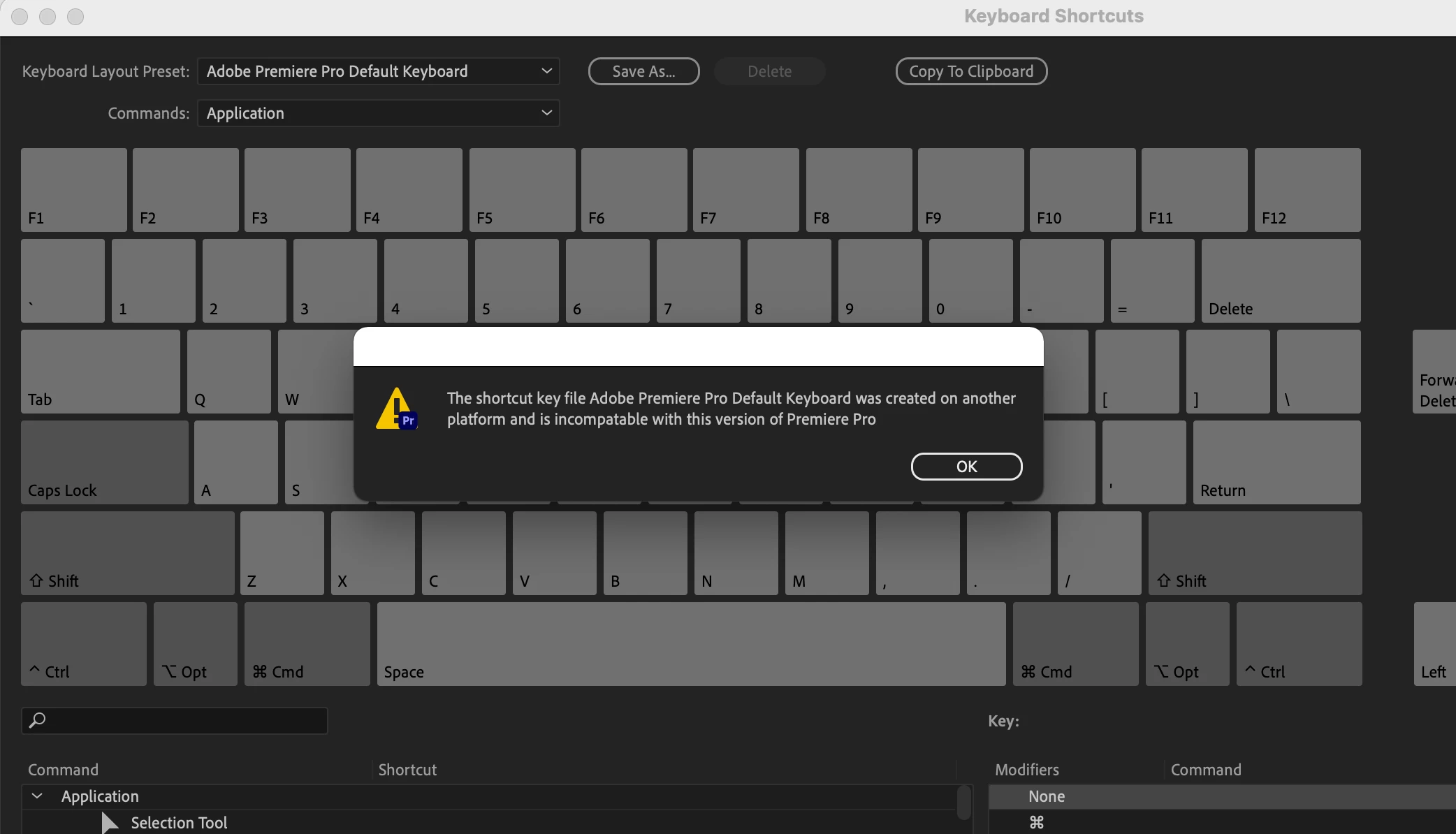 After updating to Premiere Pro 15.1.0, my default keyboard shortcuts went missing. I attempted to transfer the .kys file from Adobe/Premiere Pro/15.0/Profile-Username/Mac, but I get this error message when trying to open it in Premiere: "The shortcut key file Adobe Premiere Pro Default Keyboard" was created on another platform and is incompatible with this version of Premiere Pro". I tried reinstalling and received the same message. Any idea why I'm getting this error?