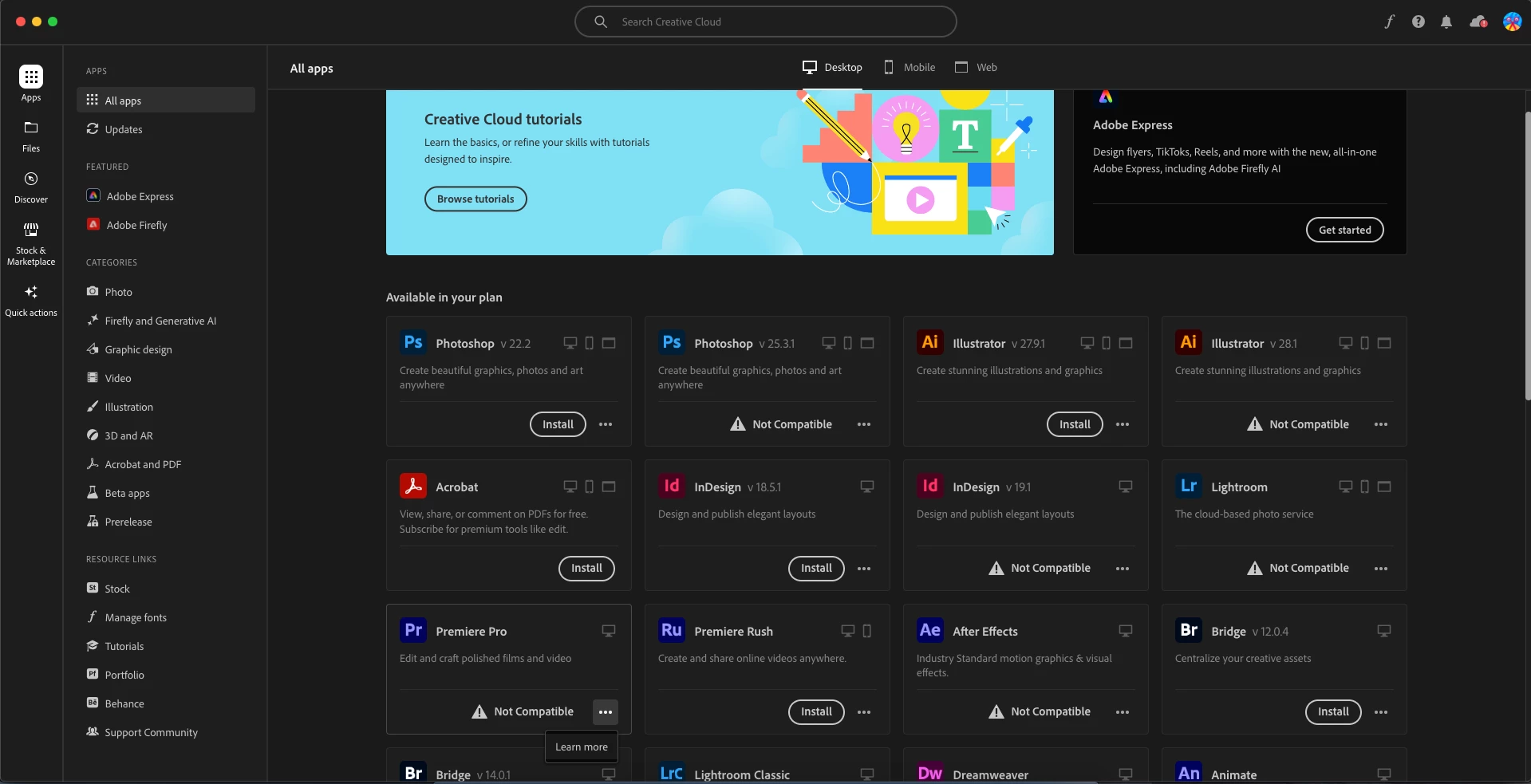 I've got a Mac with Os Catalina 10.15.7 and obviously can't download the newest version of premiere pro. When I go onto the creative cloud app however to download an older version it won't let me download any Premiere Pro Apps. How do I fix this?
