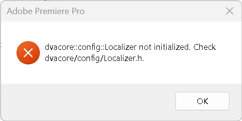 My Premiere Pro is up to date, and the Creative Cloud says nothing is wrong with it. Recently, I've tried loading it up and it says "dvacore::config::Localizer not initialized. Check dvacore/config/Localizer.h" and I'm not sure what that even means. I need help because I can't edit any videos at all and its kinda my job.