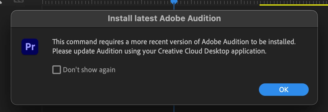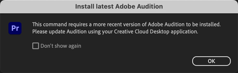 I use M1 Macbook and an up to date in terms of MacOS and Creative Cloud apps.  I get an error 'this command requires a later version of audition to be installed' Clicking OK makes the 'error' go away and I can carry on and use Audition.