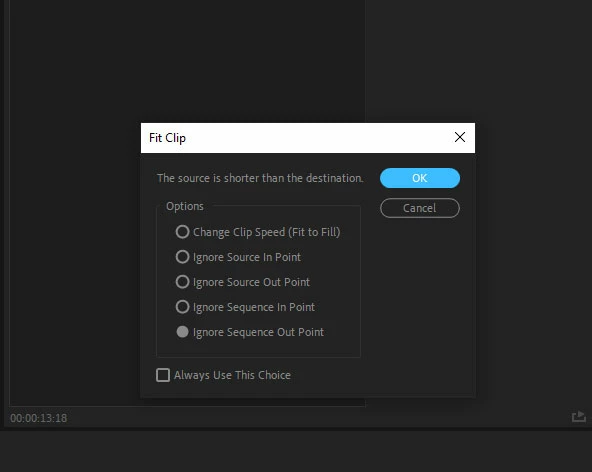 When you use the always remain choice, this panel won't show up again. So you can use the Fit clip dialog opens for edit range mismatches to bring it back.