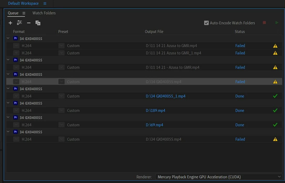 Screenshot of the attempts of the same export (named different) failed ones are the full sequince the sucssfull exports are the portions of the sequince with the failed frames when exporting the full sequince but they export sucessfully