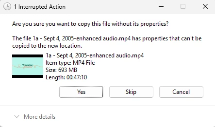 I am only using Adobe Enhanced Speech to clean up some old VHS tape files that I digitized where the audio is poor. It works great. I am able to download the video with enhanced audio to the hard drive on my computer without any issue. However, I am transfering some of the files to a USB Thumb drive and keep getting this error: