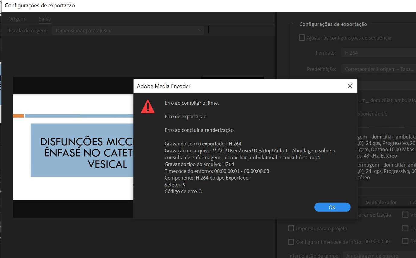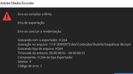 Tempo de acompanhamento: 00:00:07 26/10/2021 09:09:16 PM: Falha na escala -------------------------- ---------------------------------- Erro na exportação Erro ao compilar o filme. Erro na exportação Erro ao concluir a renderização. Gravando com o exportador: H.264 Gravação no arquivo: \\? \ F: \ EXPERTS \ Ale \ Conteúdos \ Nutella \ Sequência 06.mp4 Gravando tipo do arquivo: H264 Timecode do entorno: 00: 00: 00: 01 - 00: 00: 00: 15 Componente: H.264 do tipo Exportador Seletor : 9 Código de erro: 3