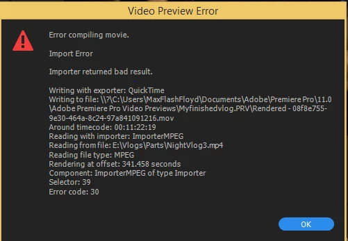 what i get as a message is : Error compiling movie - Import error - Importer returned bad result