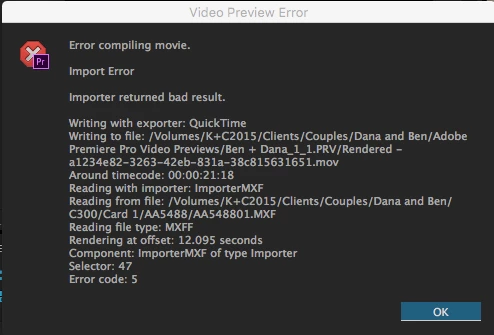 To give a little background, I had been having no issues with this project during the edit. I was using proxies and it was going fine, but when I relinked to the RAW (RED R3Ds all at 4K or over) and tried to either render my timeline, or export, I was running into this error: