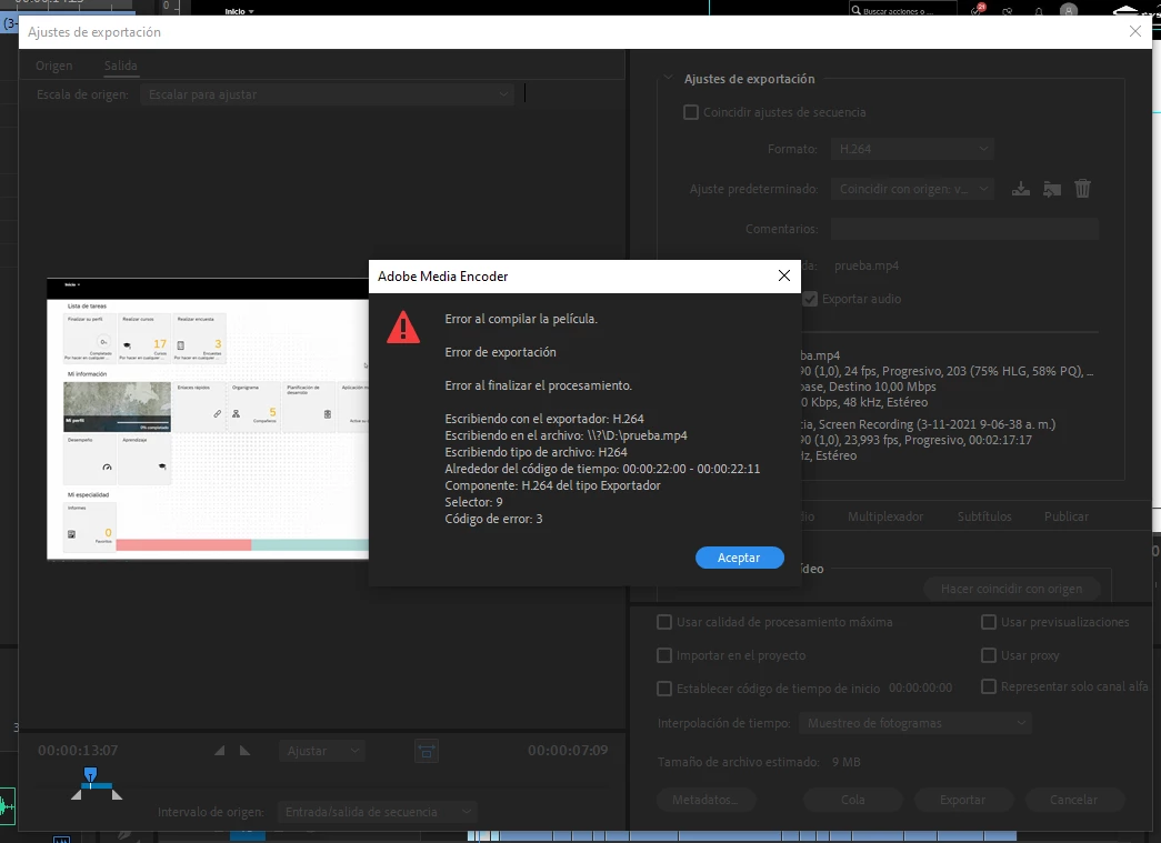 DDaniel Rojas VasquezParticipantForum|Forum|4 years agoNovember 8, 2021QuestionError de render en media encoder y premiereForum|Forum|4 years agoNovember 8, 20210 replies116 viewsHola, desde la ultima actualización a varias personas de la empresa que trabajamos con la suite adobe nos sale un error al intentar exportar en formato mp4 desde premiere o media encoder. Adjunto un pantallazo del error.ExportError or problemCrash