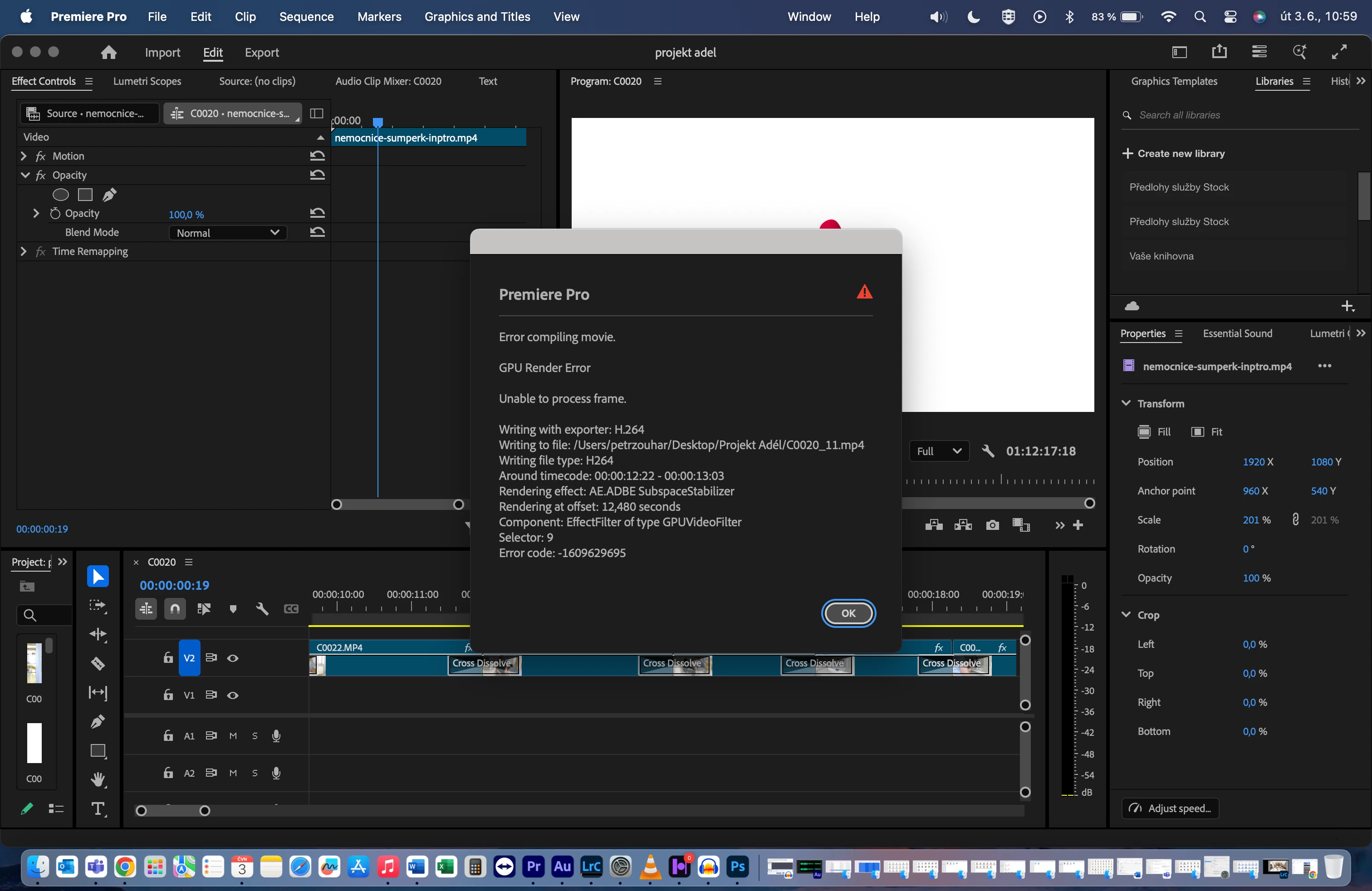 Hello, please help. When exporting a video, I get an error for videos that are stabilized. I have a Mack M4 and the Premiere version is 25.2.3. Error - 1609629695 GPU. How do I fix it? Thank you