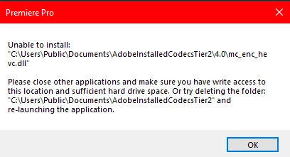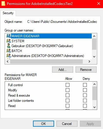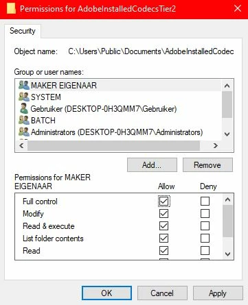 I've recently gotten this error in Premiere whenever I drag any form of video or image into the timeline. I've seen several posts here, where i've tried to give the folder full permission, write and read permission, any form of permission really. The permissions get cleared whenever I press "Ok"or "Apply". I believe that this post does work because of several people saying going into another administrator and giving acces to the folder C:\Users\Public\Documents\AdobeInstalledCodecsTier2. Going into another administrator/making a new profile for admin has worked, but giving acces to the folder can't be done.