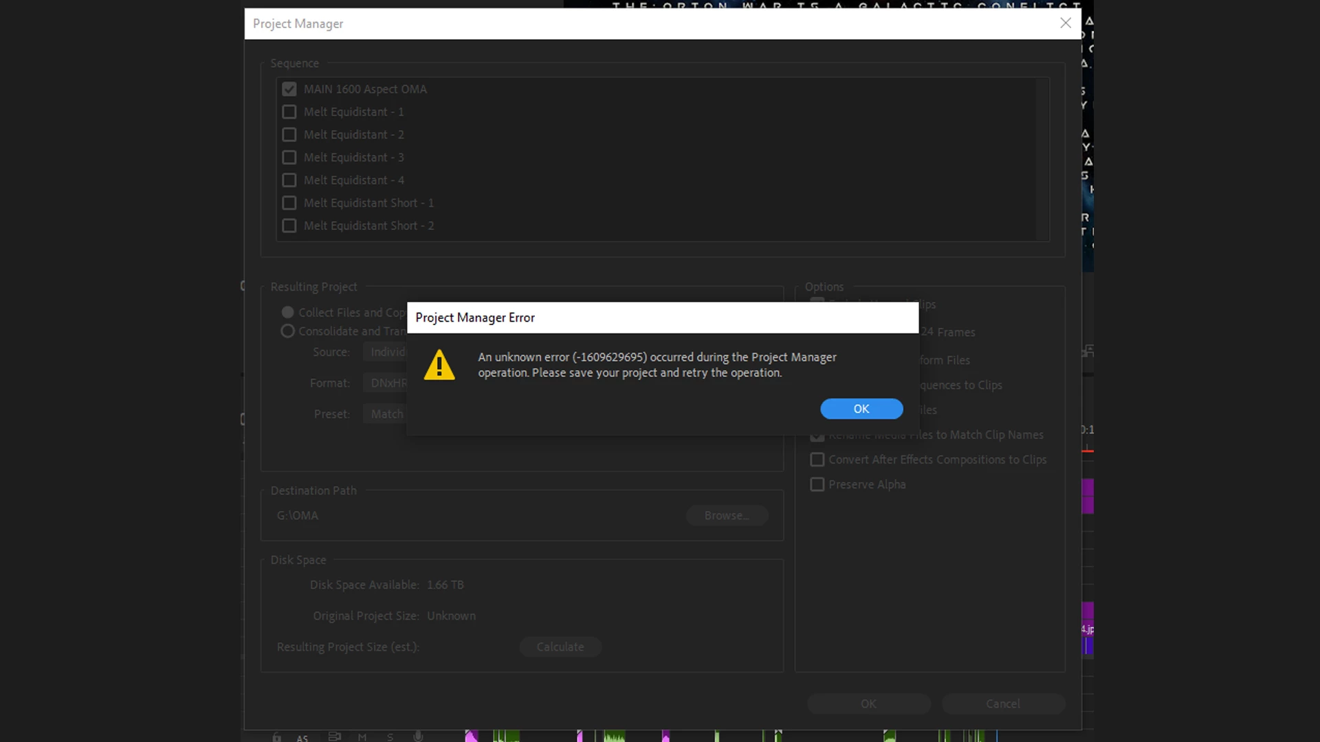 I am trying to save a new copy of a project/sequence using Project manager to copy media to a new location and this keeps failing each attempt. I have attached a screenshot of the error code that keeps re occuring.