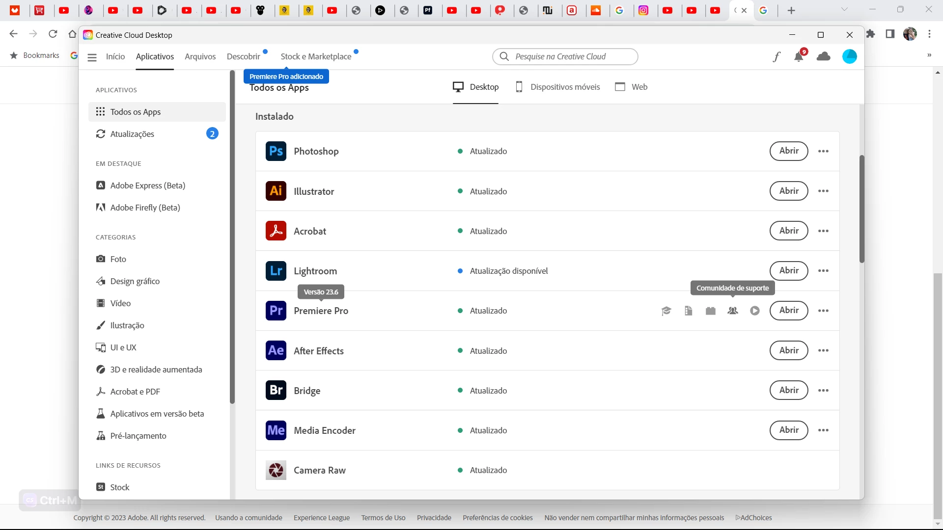 Pessoal, essa ultima atualização está horrivel, travando muito, mesmo fazendo atualização de windows e apagando arquivos do cache e também trocando de SSD Nvme, está travando muito durante a edição. O pior é que estou desenvolvendo alguns trabalhos na verção recente e não consigo abrir o projeto na versão anterior. Fica a Dica, não faça atualizações agora. Lembrando, meu pacote adobe é pago mensal.