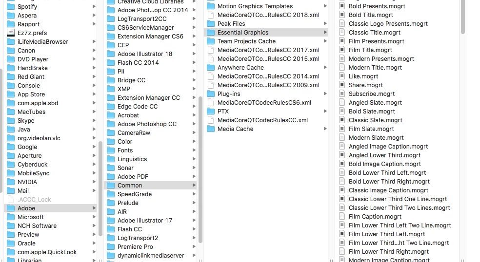 I am sure it is a simple fix but at the moment, the only Essential Graphic templates I have access to are the ones available on the Adobe Stock option. I have about 250 .mogrt files saved in Library>Application Support>Adobe>Common>Mostion Graphics Templates.