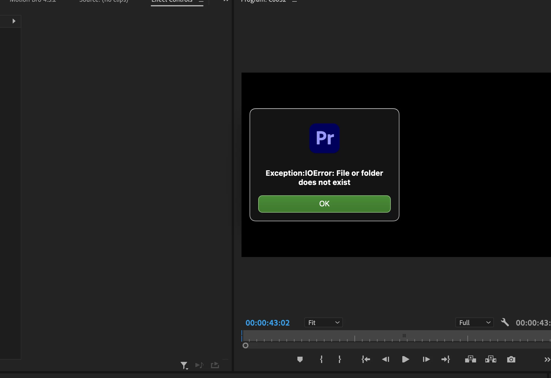 at first I of course attempted to reinstall programs/apps (creative cloud,premiere) the common solves, and it had fixed the problem momentarily I had noticed no error pop up, and so I began installing my plugins, 1 by 1, which of course is how I solved that it was indeed the Motion Bro plugin, causing some sort of error.