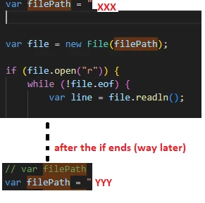3) later in the code I have a new var filepath = yyy (after the IF is done and line = xxx done)