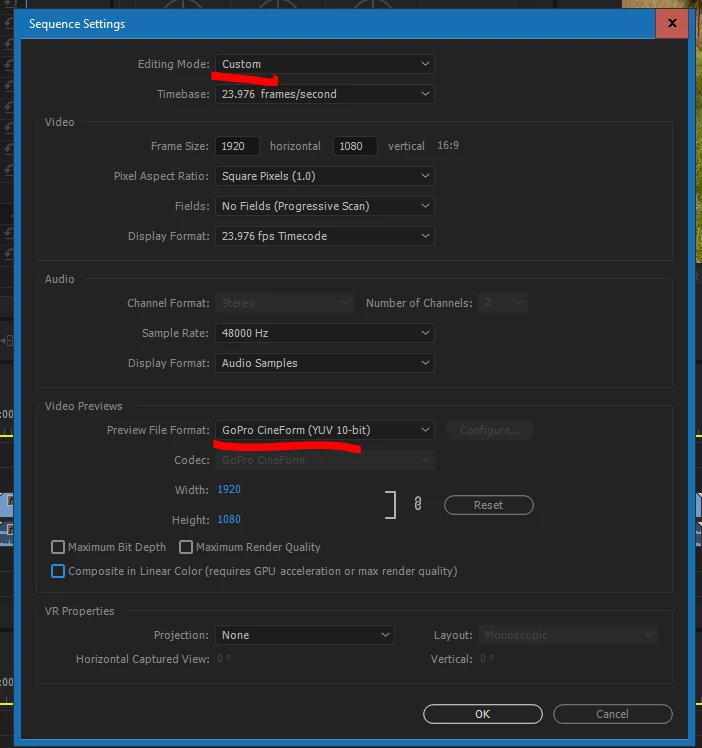 If you hit the drop-down list at the top, there's a lot of "standard" ones for quite a number of things. I like using the Cineform YUV 10-bit, so I just use "custom" at the top of the drop-down list options for "Editing mode" set to 1920x1080 for the vast majority of my work (I do some 4k, not a lot). Then set the GoPro Cineform in the Video Previews box. Normally, I just leave off "Maximum bit depth", Maximum Render Q" and "Composite in Linear ... " as they don't help my workflow.