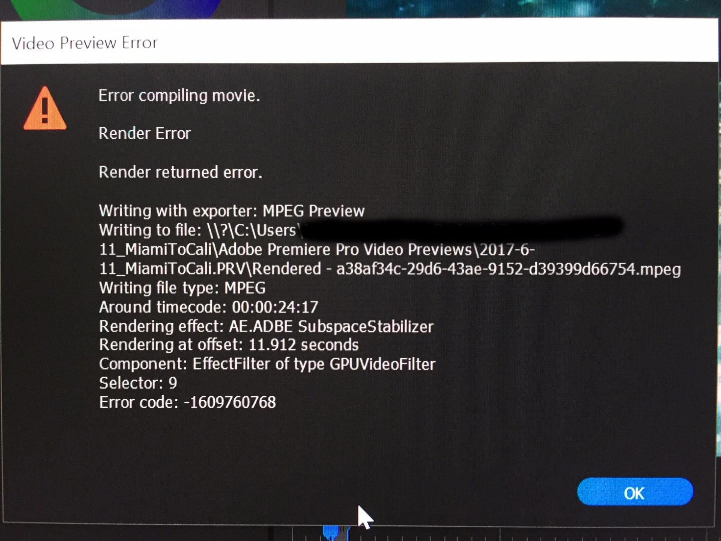 Export Error Error compiling movie. GPU Render Error Unable to process frame. Writing with exporter: H.264