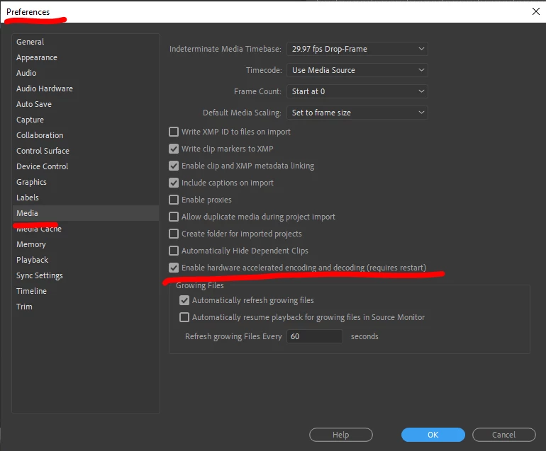 Try going to your Preferences/Media dialog, and un-check the option to enable hardware accelerated encoding and decoding. In the image below, I have that option checked. Uncheck yours.