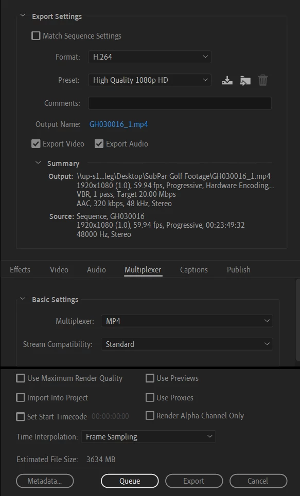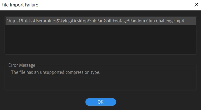 I've attached my export settings within Premiere Pro, the error message I get when clicking on the exported file, and the error message given when I try to put the file back into Premiere Pro.