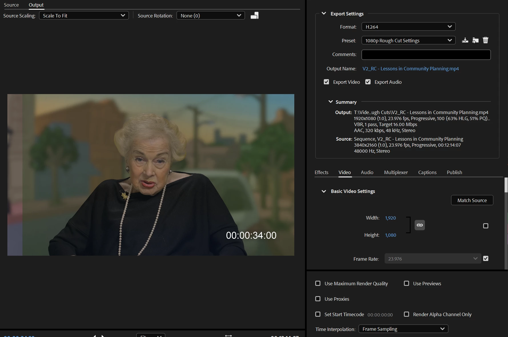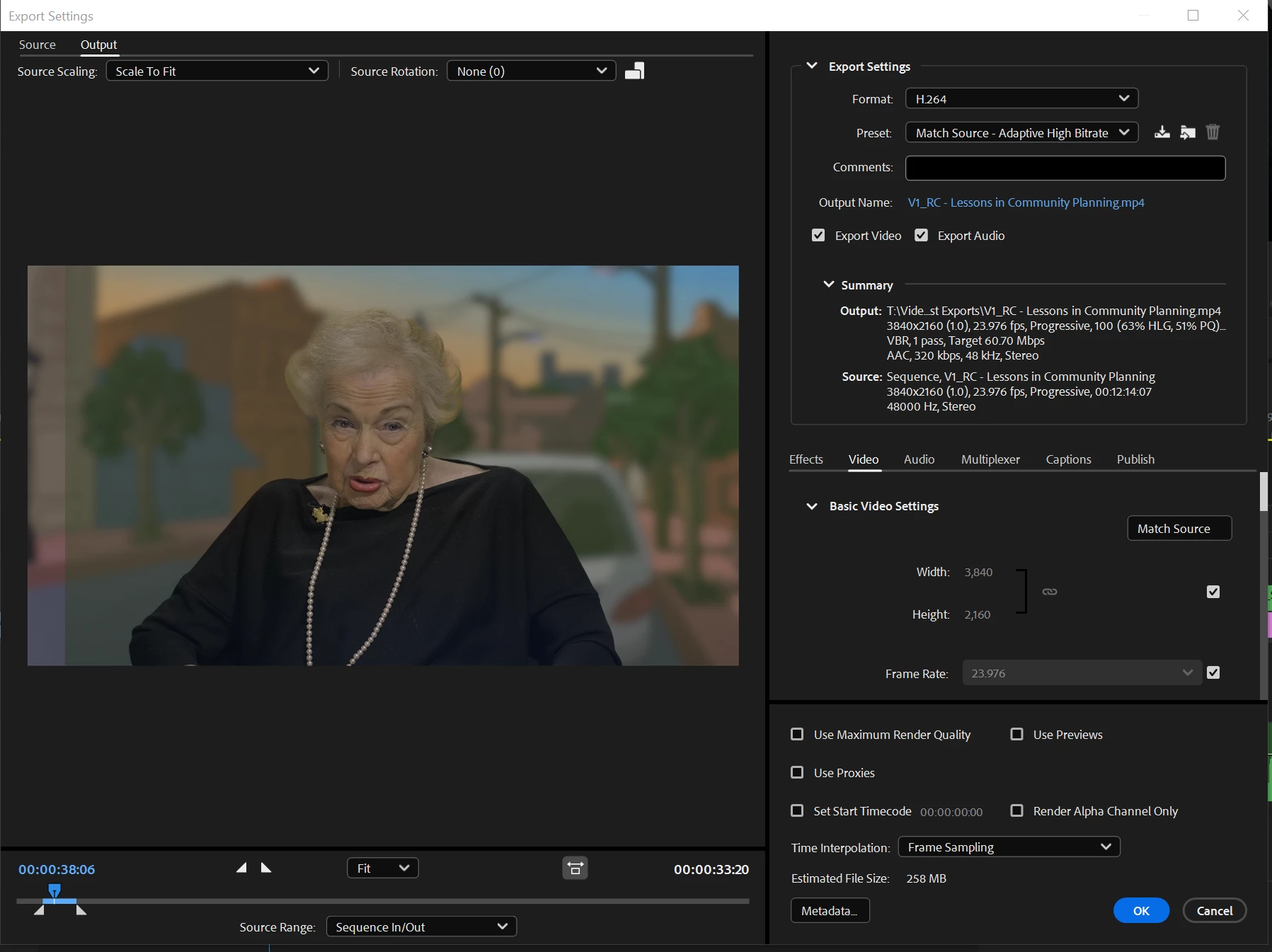 Working on a PC, the HP Xeon G4 Workstation, 32gb RAM, NVIDIA Quadro P6000 graphics card, 28 Cores, the latest version of Premiere 2023. Shot in a log profile DNxHR HQX, UHD resolution, the effects used are Ultra Key, crop, and Lumetri Color. Exporting to 1080p H.264 with timecode. Sequence settings set the color space to Rec 709 also.