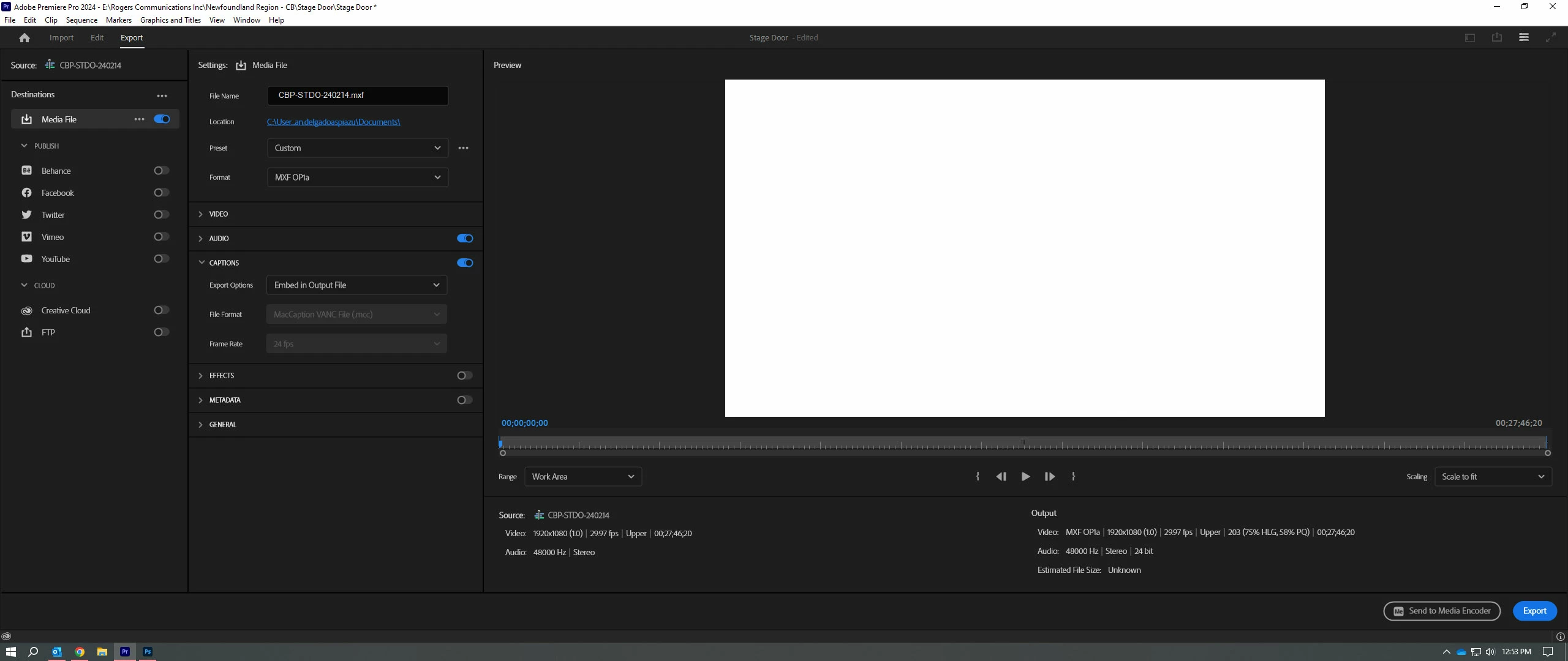 I'm working on Adobe Premiere 24.1 and when I try to export an MXF OP1a file with embedded 708-1 captions, the file exports correctly, but the ancillary data is not present. I test my files with MediaInfo, and this is the first time this happens.