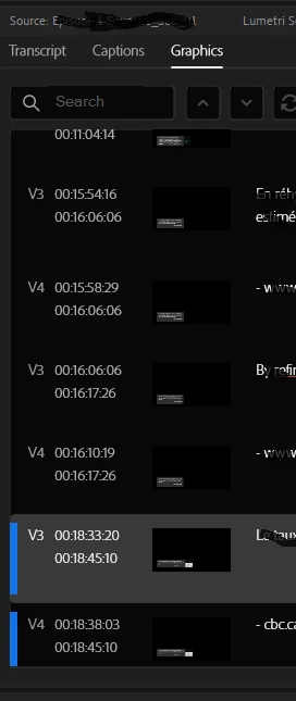 In the captions and Graphics Panel, there is a graphics section with very useful information about graphics in the graphics Tab. It lists all the titles used in the project with their time codes in the project.